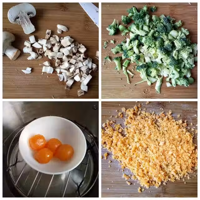 3.蘑菇、西蘭花洗凈,切丁;鹹蛋黃隔水蒸熟,我冷水上鍋,大約10分鐘左右,然後取出切碎。