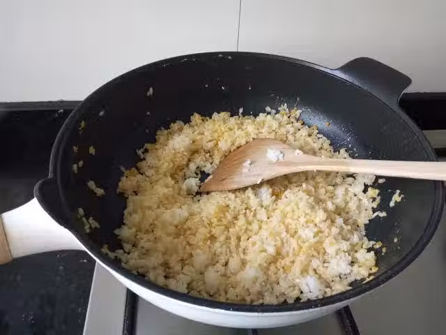 7.加入米飯,翻炒均勻,至每一顆飯粒都沾上鹹蛋黃。