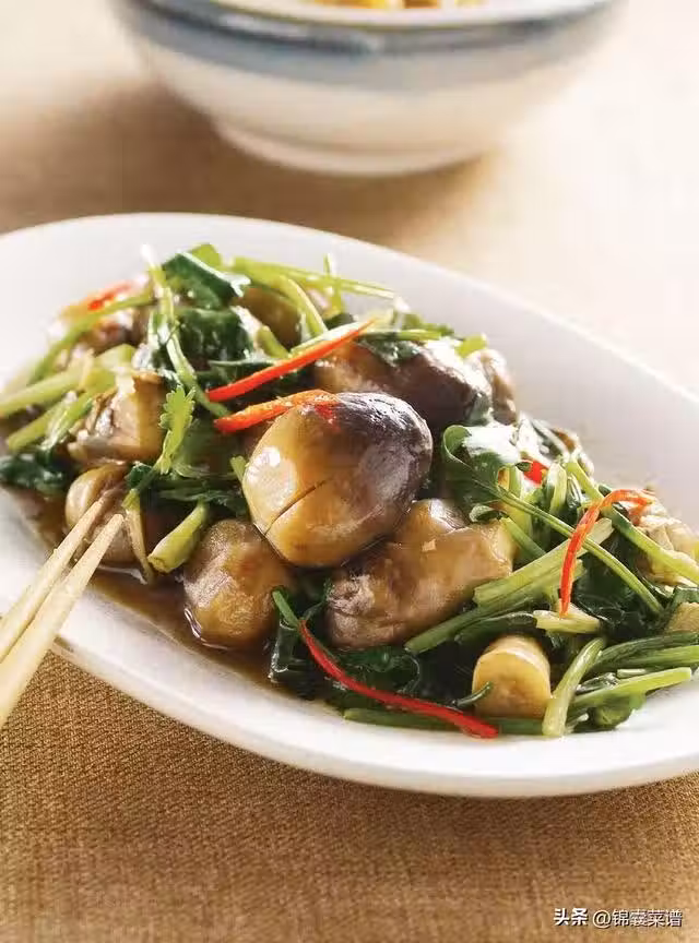 草菇 150 克,香菜 30 克,薑絲、紅辣椒絲各 10 克