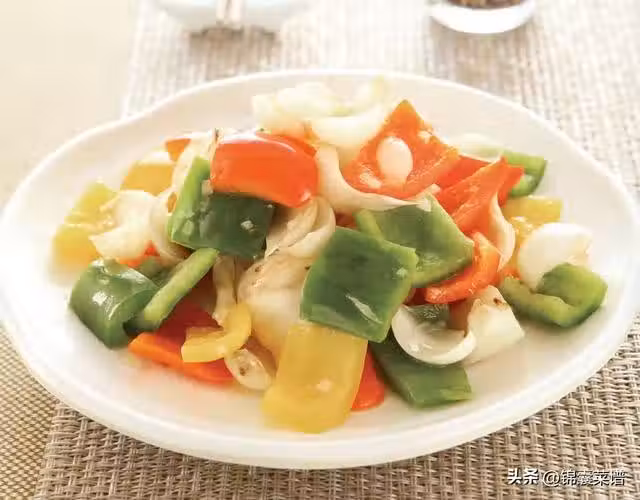 2 熱鍋,倒入少許植物油燒熱,小火爆香薑末,再加入青椒片、甜椒片炒勻。