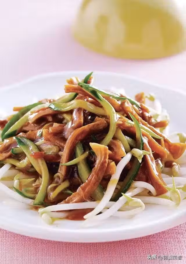 2 將素肉排切絲;小黃瓜洗凈切絲,備用。