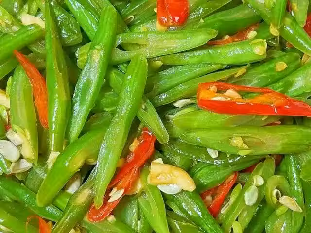 2、起鍋燒油,油熱後放入小米辣和蒜末炒出香味,再放入四季豆翻炒均勻,翻炒至四季豆斷生,再加入一勺食鹽和生抽調味。