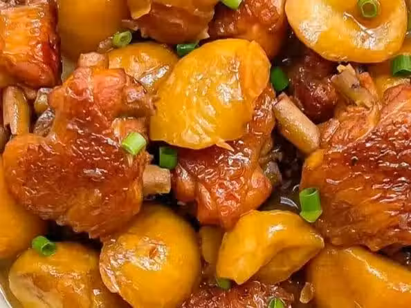 2、起鍋燒油,油熱後放入冰糖翻炒一會兒,炒出棗紅色糖色,再放入雞中翅翻炒均勻上色,然後放入板栗、薑片和蔥段翻炒幾下。