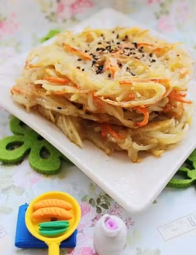 土豆2 個胡蘿蔔1根 澱粉50g 椒鹽適量 味精適量 豆油30ml 黑芝麻1/2勺 白芝麻1/2勺
