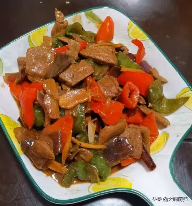 3、碗里加入適量生抽、老抽、蚝油、白糖、食鹽、澱粉、清水,攪拌均勻備用。鍋里倒入適量油,燒熱後下入姜蒜、干辣椒爆香,倒入洋蔥、青紅辣椒,大火翻炒至斷生。倒入焯過水的豬肝片,淋入料汁翻炒均勻,大火收汁即可出鍋。