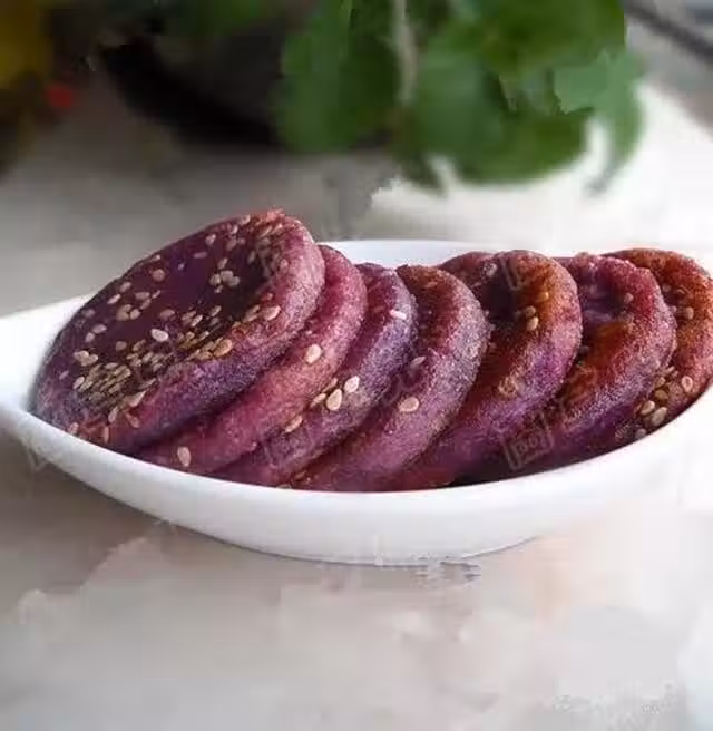 5.紫薯麵糰擀開,鋪上白芝麻,做成40餘個小餅,。
