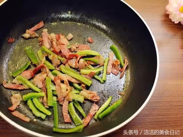 4.倒入青椒,改轉小火,炒至均勻接觸油末。