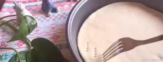 處理好榴槤之後,我們的麵糰也醒發得差不多了,這時可以把麵糰拿出來,揉去氣泡,然後用擀麵杖把麵糰擀成薄餅,薄餅的大小根據你的烤盤決定,薄餅擀好之後,放入烤盤當中,再包上保鮮膜醒發10分鐘,醒發好之後,用個餐叉在麵皮上面戳一些小洞,方便透氣!接下來烤箱提前預熱,然後把裝有麵皮的烤盤放入烤箱,20°C烤5分鐘至麵皮定型!