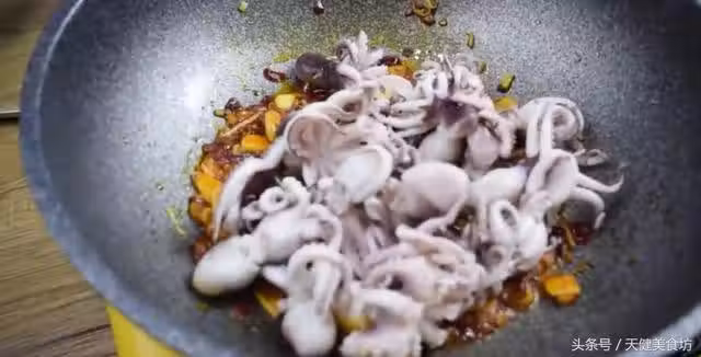 八爪魚處理好之後,就開始正式進入做菜階段,起鍋加油燒熱,油溫燒至5成熱,轉成小火後,把切好的薑片,蒜末,倒入鍋中慢慢爆出香味。香味出來之後加入1湯匙的豆瓣醬,炒出豆瓣醬的紅油後,把處理乾淨的八爪魚倒入鍋中,轉成大火快速翻炒,把八爪魚跟鍋里的配料翻炒均勻!