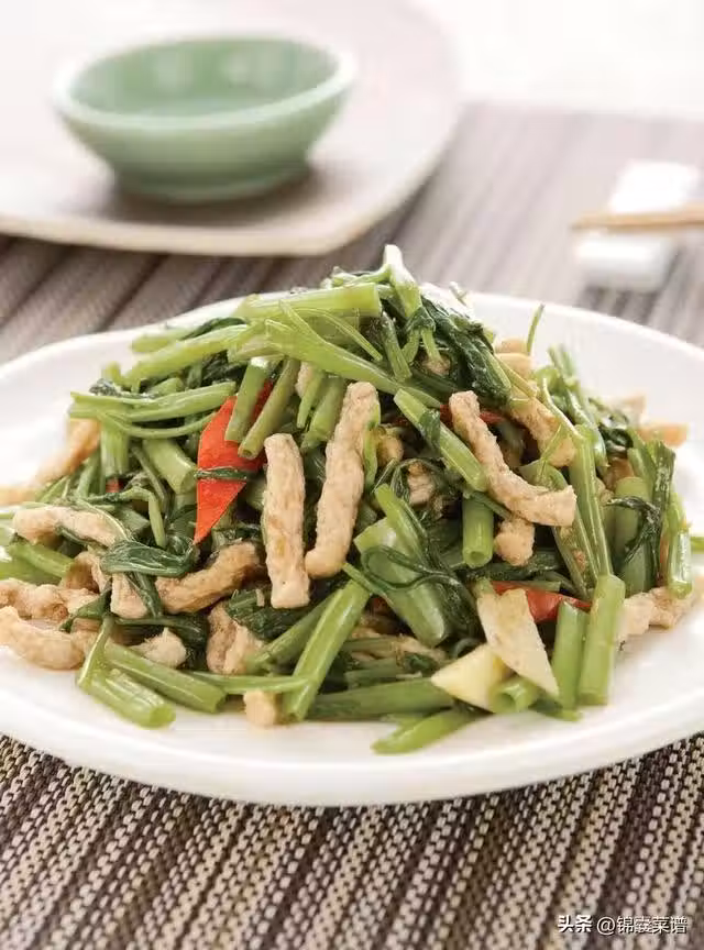 2 炒鍋倒入適量油燒熱,加入薑片炒香,再放入素肉絲、空心菜段、紅辣椒片、水和其餘調料炒勻即可。