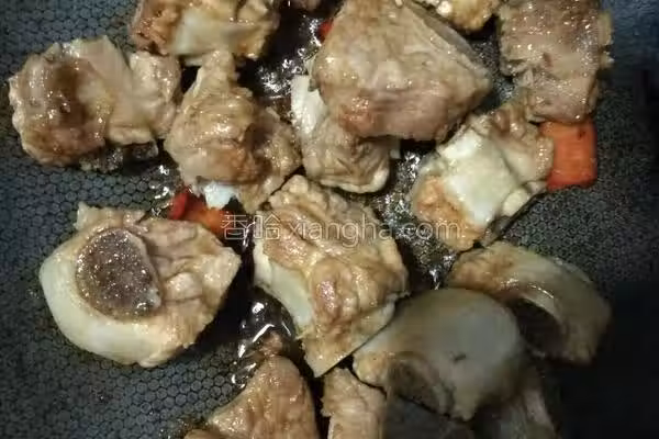 5.加入沒過排骨的水,用大火燒開轉小火,把桂皮,八角,花椒,黃豆一起丟入鍋內,蓋上鍋蓋,燜30分鐘左右。