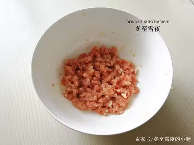 5.將肉泥放在碗中,加入蔥末,薑末,少許鹽,少許胡椒粉,料酒,朝一個方向攪拌均勻