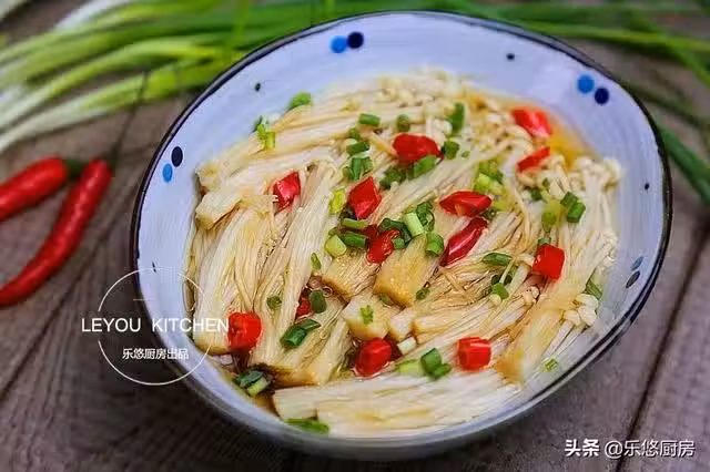第一步:準備食材。金針菇1把、紅辣椒幾個、香蔥適量。