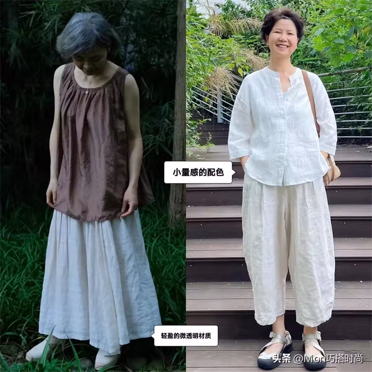 高密度亞麻、多層雪紡等微透明寬鬆長衫、露膚多的無袖背心、小碎花、淺色等小量感配色都可以讓瘦削身形更為仙氣飄飄~