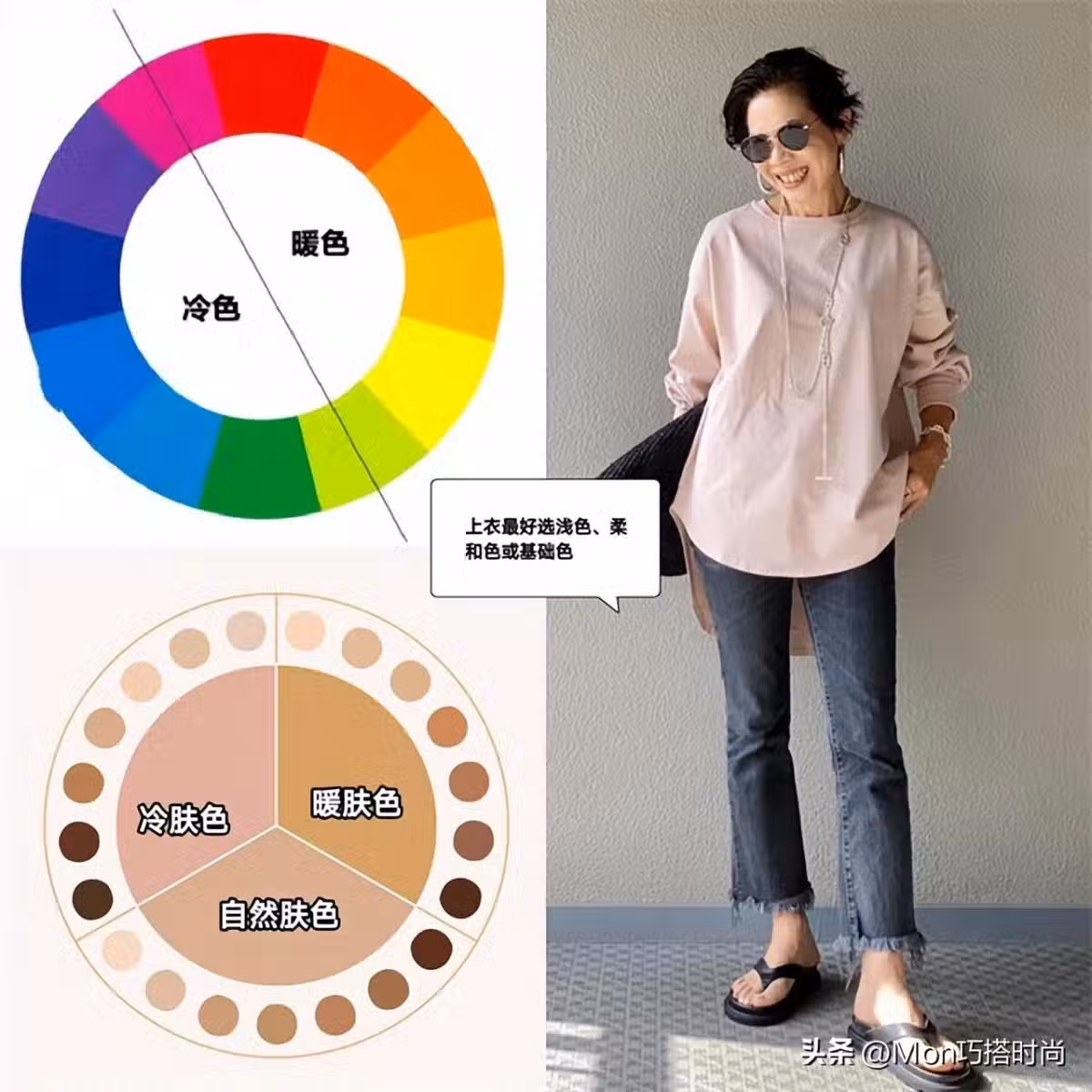 如果想讓自己的氣色顯得更好,那就得從上衣的顏色入手。膚色越深越需要選亮度高、偏白色調的服裝去提亮。且上衣的冷暖色調用和膚色的冷暖色調一致。