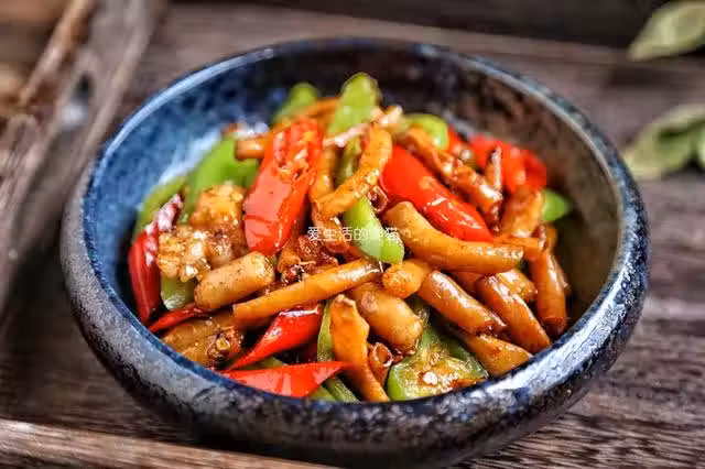 2,熱鍋,放入適量的食用油,爆香姜蒜和紅尖椒,放入羊腸爆炒片刻