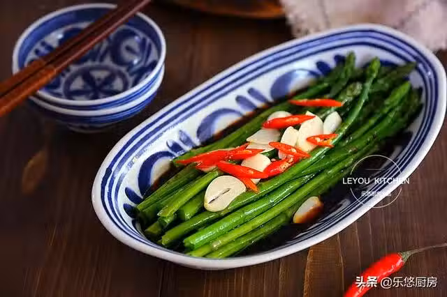 第一步:準備食材。蘆筍1把、紅辣椒適量、蒜適量。