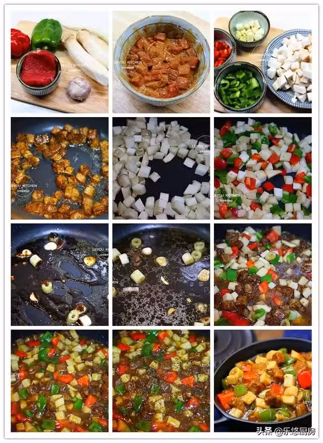 第六步:把青椒和紅彩椒放入鍋中煸炒十幾炒,然後把鍋里所有的蔬菜盛出備用。