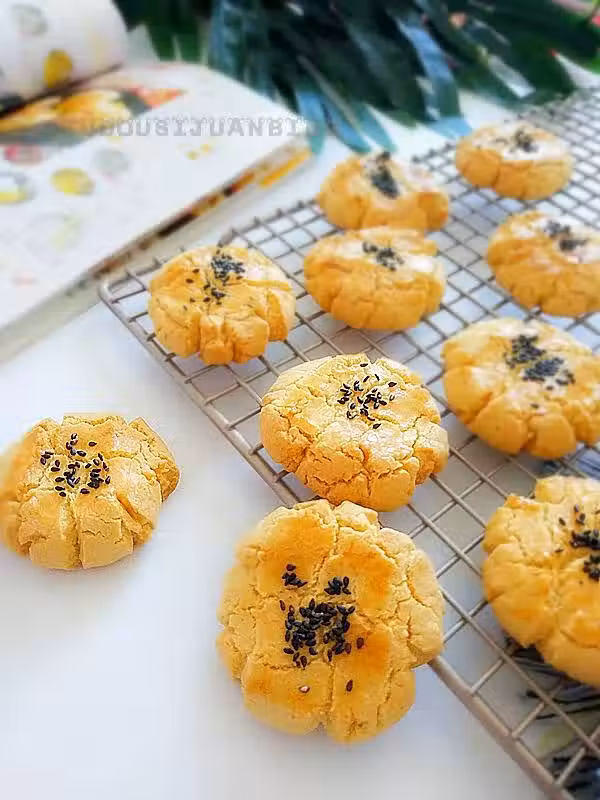 材料:低筋麵粉200克,玉米油80克,糖50克,全蛋液40克,泡打粉2克,小蘇打1克,黑芝麻適量