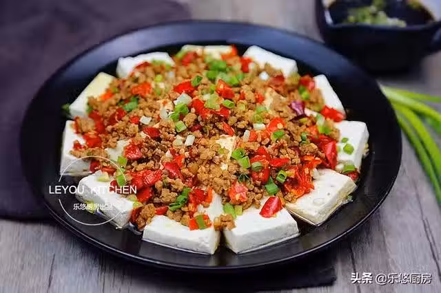 第二步:將豆腐切成片,然後鋪在盤中,如圖。蔥姜蒜切末備用、香蔥切末備用。