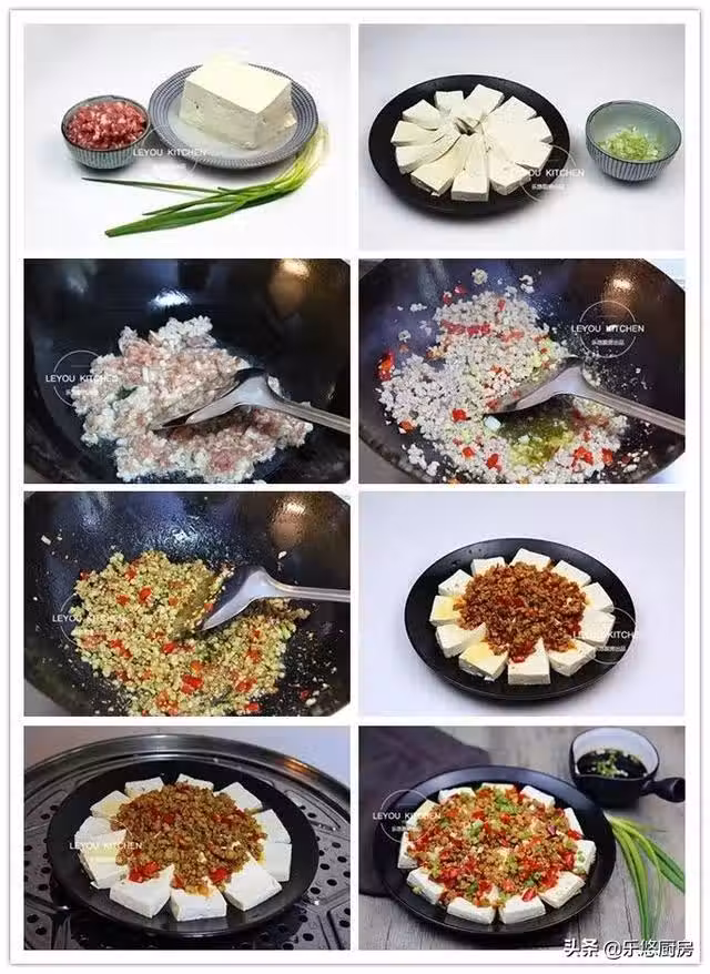 第六步:將炒好的肉末放在豆腐上,如圖。