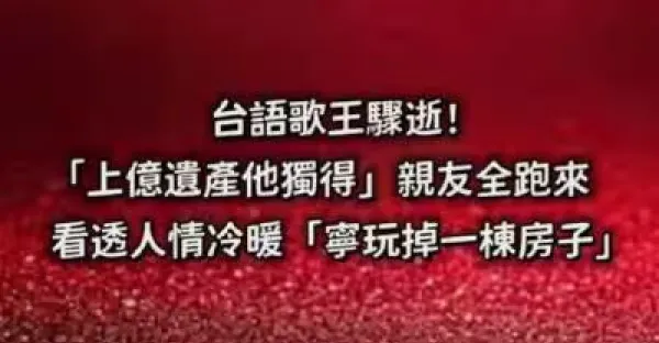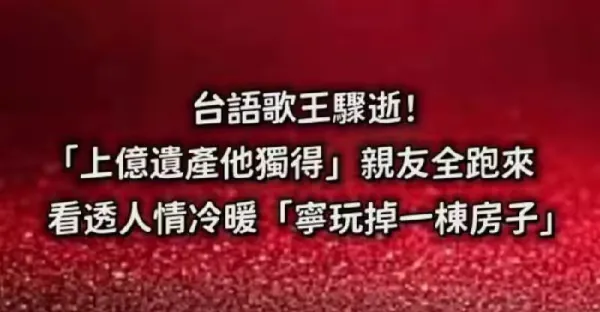 台語歌王驟逝!「上億遺產他獨得」親友全跑來,看透人情冷暖 「寧玩掉一棟房子...」