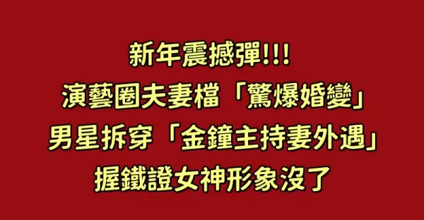 新年震撼彈!!! 演藝圈夫妻檔「驚爆婚變」男星拆穿「金鐘主持妻外遇」握鐵證女神形象沒了