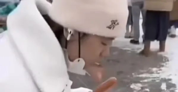 全紅嬋也愛吃烤腸!冰天雪地吃得津津有味,咬下一塊吐地上,喂給狗吃