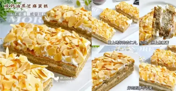 【咸奶油黑芝麻粉蛋糕】做法簡單,酥脆的杏仁片咸香的奶油軟綿的蛋糕,加了黑芝麻粉口感更豐富