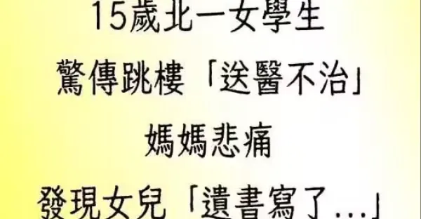 快訊/15歲北一女學生驚傳跳樓「送醫不治」! 媽媽悲痛發現女兒 「遺書寫了...」 讓家人崩潰自責!