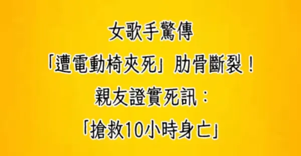 女歌手驚傳「遭電動椅夾死」肋骨斷裂!親友證實死訊:「搶救10小時身亡!」