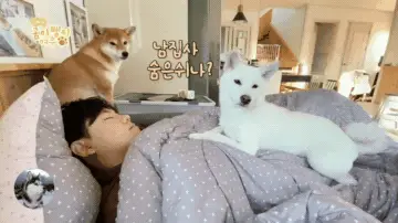 鏟屎官也有自己的辦法,比如假裝睡覺,哪怕狗子已經圍著自己了,但是寵主還是用「演技」騙過了毛孩子,就是白柴犬不好糊弄過去。