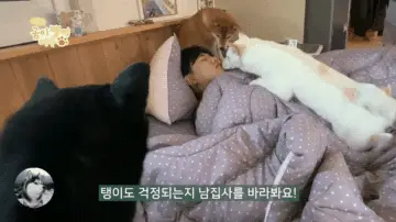 黃柴比較黏人,相對來說會更貼心一些,它安安靜靜地坐在主人枕邊,然後小心翼翼地爬到被子上。