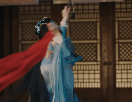 劇中她的動作戲不少,竹林舞劍、紅綢破陣的場面,有一種剛柔並濟的美,身段輕盈,行雲流水。
