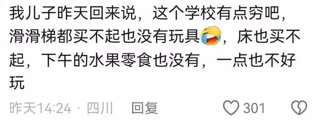 「這學校有點窮吧,滑滑梯買不起,玩具也沒有,床也沒有,水果零食也沒有,一點兒也不好玩。」