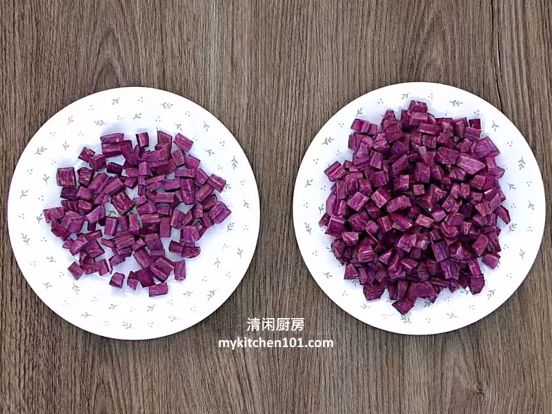 1 把紫薯去皮後切丁,分成50克和150克。(溫馨提示:建議採用顏色比較深的日本紫薯。)
