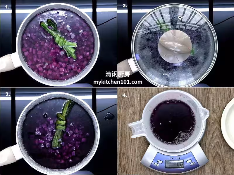 1 *紫薯湯:把450克清水滾開,加入150克紫薯丁和2葉香蘭葉。再次加熱至滾開,以中小火煮15分鐘。取出280克紫薯湯。