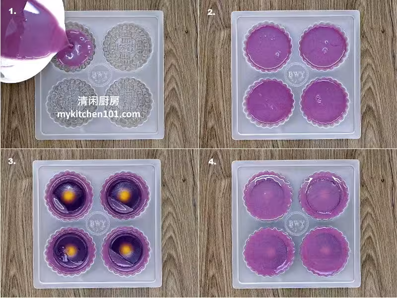 1 把少許紫色燕菜月餅皮倒入燕菜月餅模里,加入紫薯燕菜月餅餡,再倒入紫色燕菜月餅皮直到滿。
