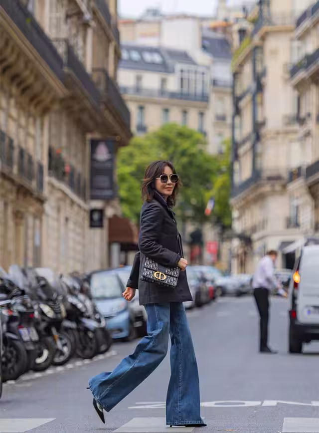 這身穿搭春秋穿剛剛好,上身是一件黑色外套,衣長蓋住了屁股,具有良好的保暖性。下身則是一件藍色牛仔褲,它的出現在意料之中,畢竟牛仔褲不限年齡、不限腿型。這條褲子屬於寬鬆版型,腿部活動空間自然不少,那麼舒適度就不低。腳上可穿一雙細高跟,讓你秒變時尚模特。
