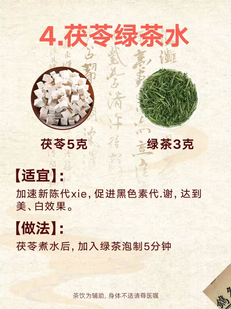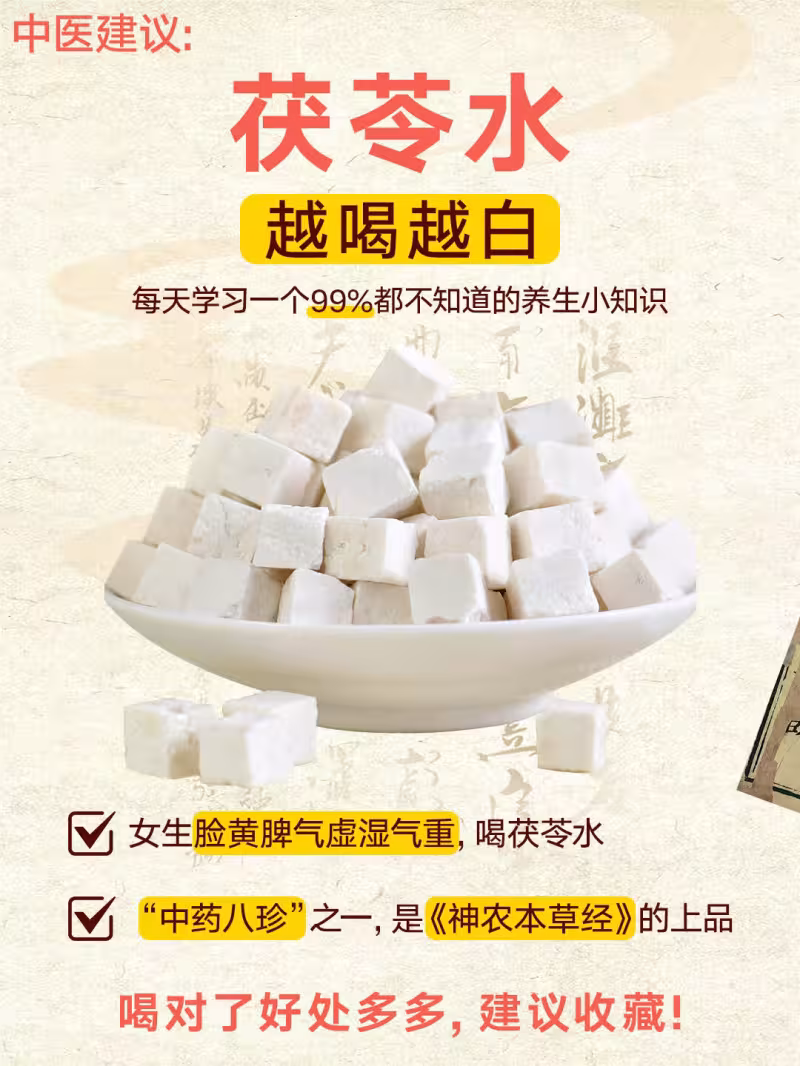 🌱《本草綱目拾遺》記載:茯苓「久服令人面若童顏,白皙悅澤」,可見茯苓在內調美/白方面確實「有一手」,在古代醫籍中就備受推崇,是調養膚色暗黃、追求肌膚透亮的常用💊材~