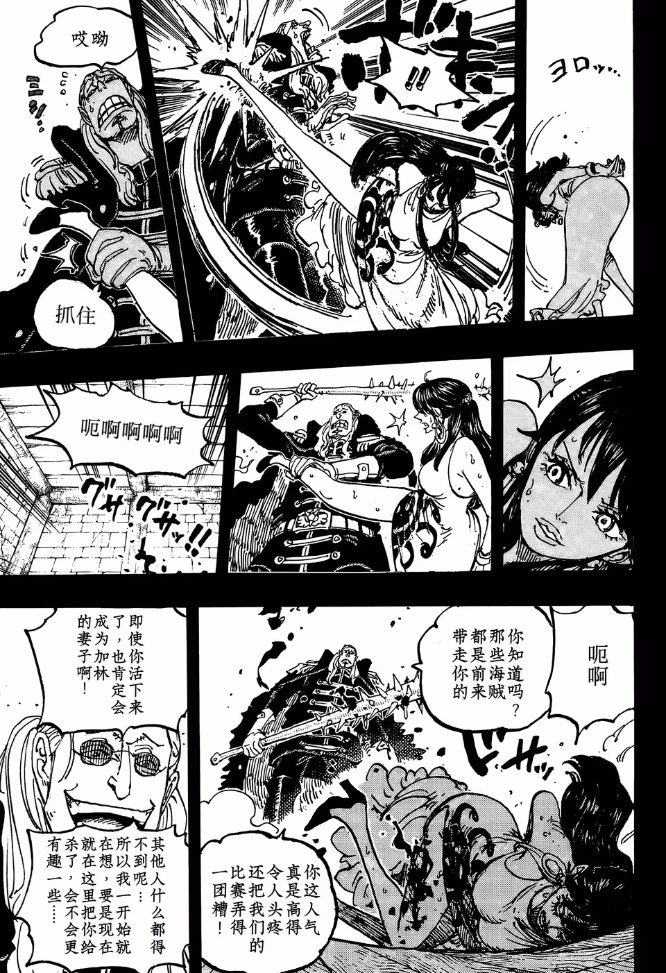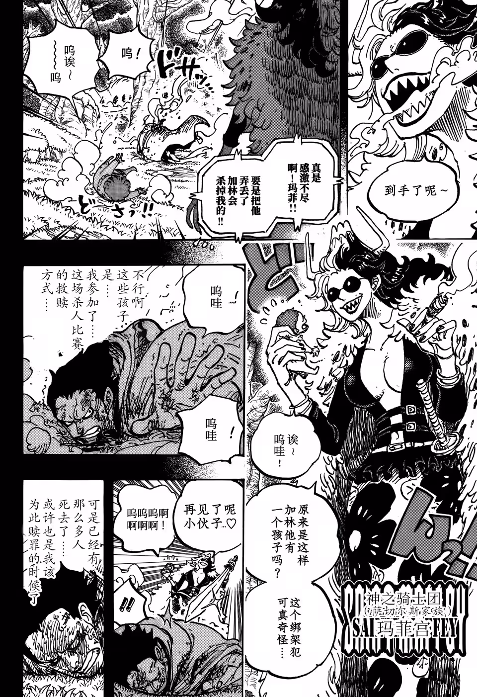 龍也看到了自己的老爸,大媽使用了火焰風暴攻擊卡普,威力十分強大,不過卡普只是被燒成黑炭,一點傷害都沒有。大媽看到卡普沒有受傷,只能全力逃跑了,瑪菲宮以為龍死了,龍抱起孩子逃跑,神之騎士團還在獵殺原住民和海賊。