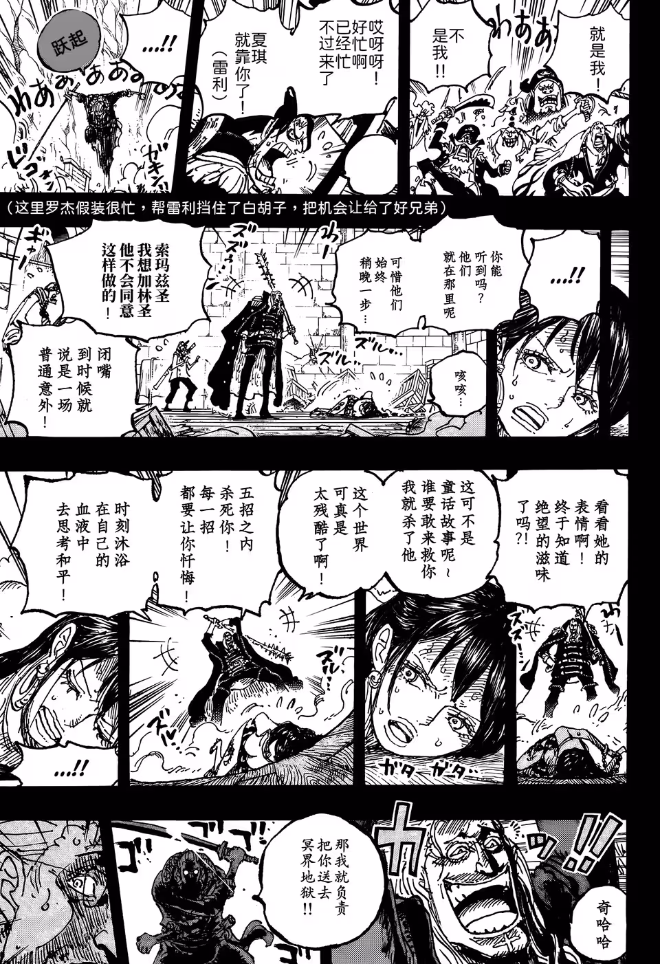 神之谷大戰徹底爆發,每個海賊都有自己的目標,天龍人也在責罰海軍,他們帶來的財寶還沒有拿走,海軍讓天龍人趕緊逃跑,財寶的話海軍會幫忙保管,不過天龍人不信。羅傑在尋找夏琪,洛克斯在尋找老婆和孩子,卡普在尋找羅傑。