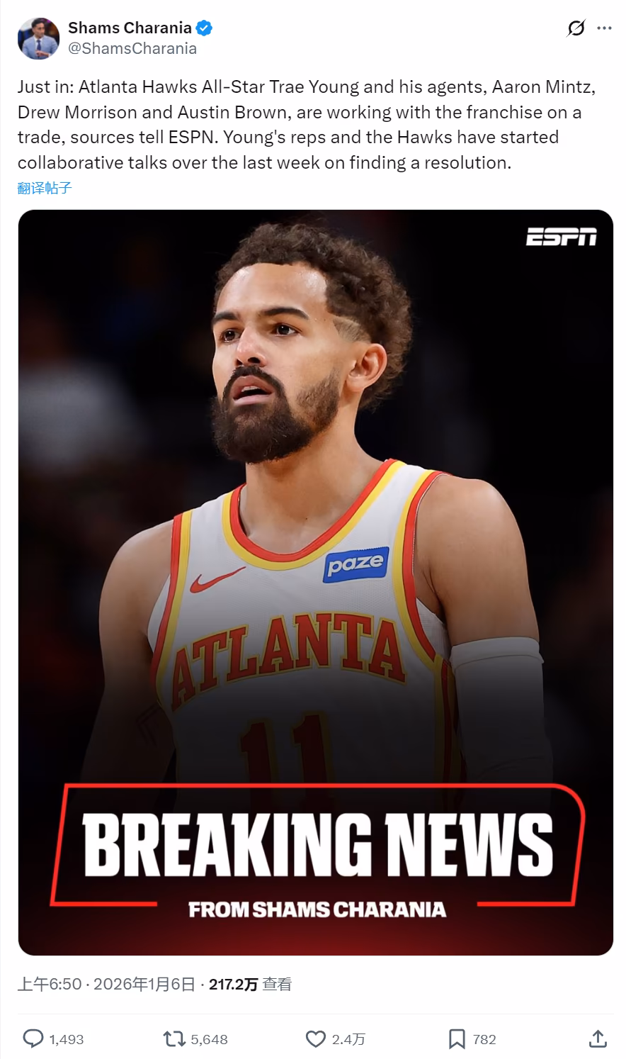 時間1月6日上午,NBA名記Shams報道,特雷-楊已經提出交易申請,他和經紀團隊正與老鷹管理層商討交易事宜。Shams表示,自老鷹拒絕4年2.29億續約特雷-楊之後,他的經紀團隊一直跟管理層溝通,從上周開始討論交易。