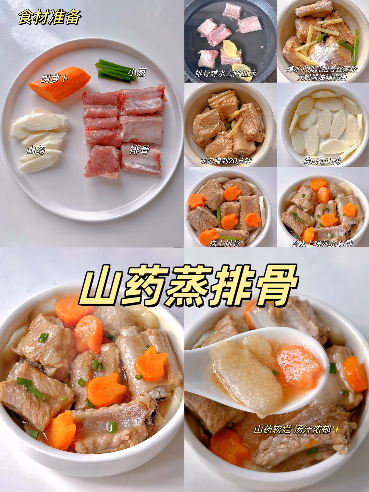 準備食材:胡蘿蔔、山藥、排骨、蔥、姜 配料:料酒、生抽、蚝油、澱粉、橄欖油