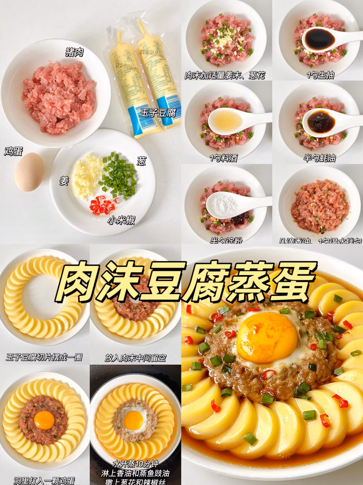 ✅第五款:肉末豆腐蒸蛋 準備食材:雞蛋、豬肉末、玉子豆腐、姜、蔥、小米辣 配料:生抽、蚝油、料酒、澱粉、香油、蒸魚豉油