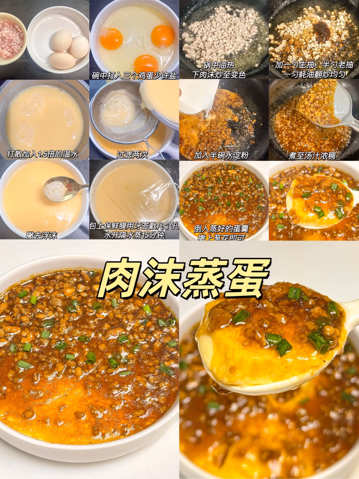 ✅第六款:肉末蒸蛋 準備食材:雞蛋、豬肉末、蔥花 配料:食鹽、生抽、老抽、蚝油、澱粉