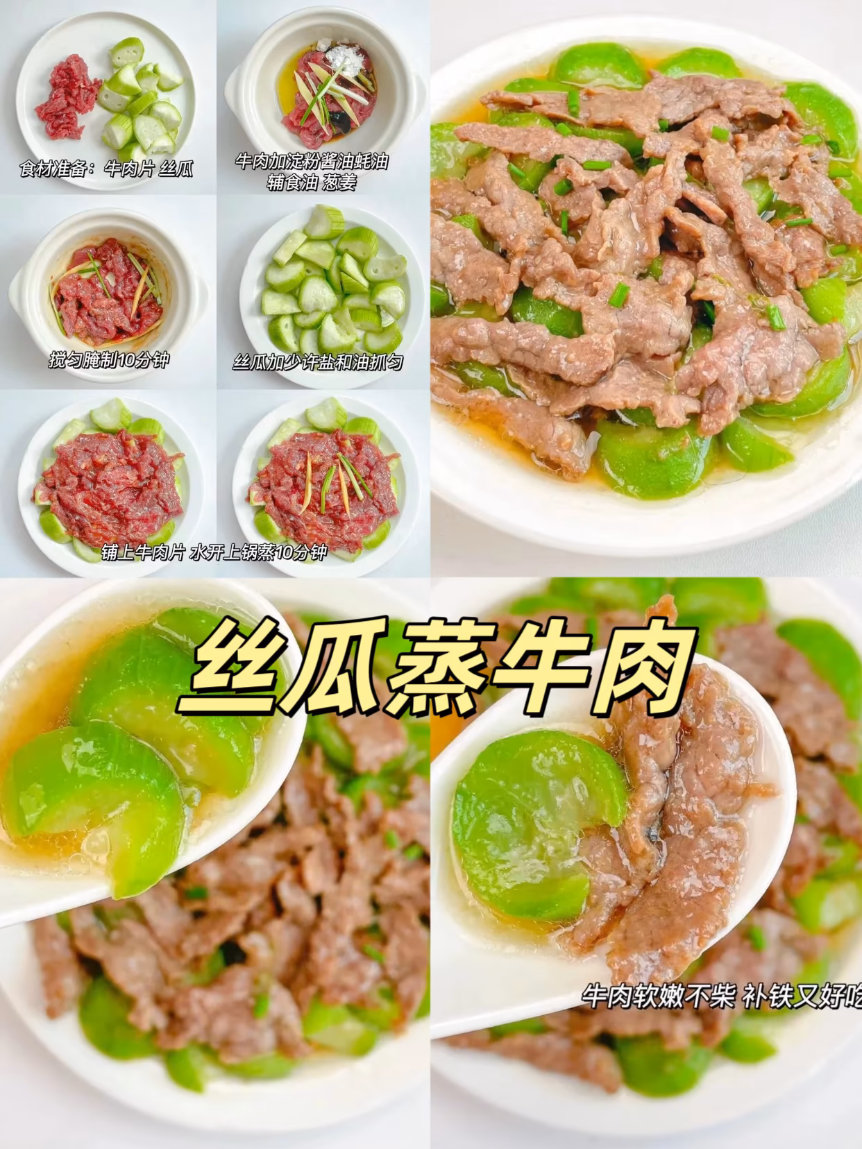 ✅第八款:絲瓜蒸牛肉 準備食材:絲瓜、牛肉、生薑、蔥花 配料:蚝油、生抽、澱粉、香油