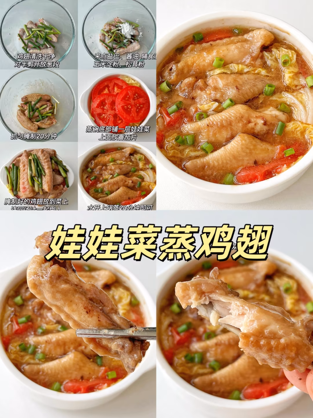 ✅第九款:娃娃菜蒸雞翅 準備食材:雞翅、娃娃菜、番茄、蔥花、薑絲 配料:生抽、食鹽、澱粉、松茸粉、香油