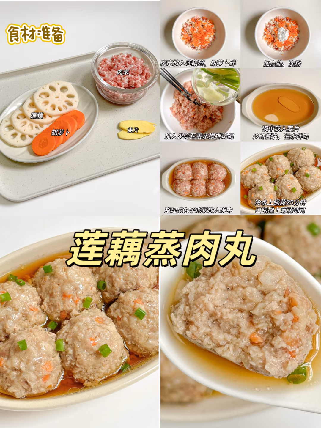 ✅第十款:蓮藕蒸肉丸 準備食材:蓮藕、豬肉末、胡蘿蔔、蔥花、薑片 配料:生抽、澱粉、食鹽