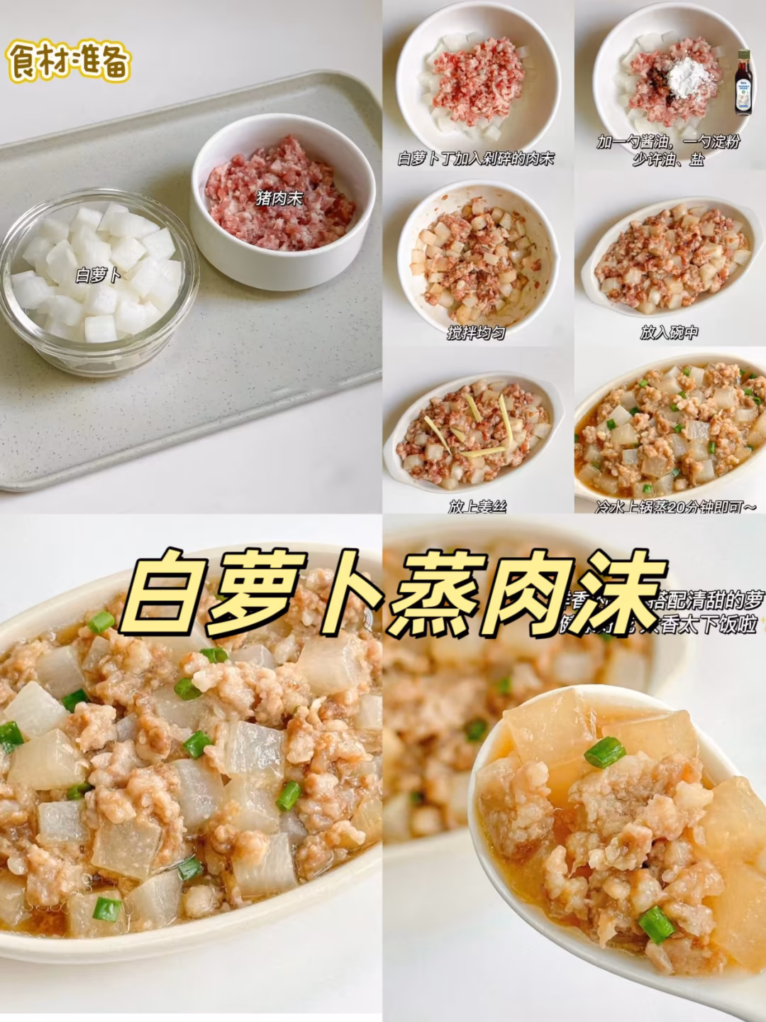✅第十一款:白蘿蔔蒸肉末 準備食材:豬肉末、白蘿蔔、薑絲、蔥花 配料:生抽、澱粉、 食鹽、橄欖油